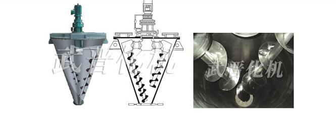 由螺旋的公、自轉(zhuǎn)使物料在錐體內(nèi)產(chǎn)生復(fù)合運動,主要產(chǎn)生四種運動形式:螺旋沿壁公轉(zhuǎn),使物料沿錐壁作圓周運動; 螺旋自轉(zhuǎn)使物料自錐底沿螺旋上升; 螺旋的公、自轉(zhuǎn)復(fù)合運動使一部分物料被吸收到螺旋圓柱面內(nèi)同時受螺旋自轉(zhuǎn)的離心力作用使螺旋圓柱面內(nèi)的一部分物料向錐體徑向排放;上升的物料受自身重力作用下降。四種運動在混合機(jī)內(nèi)產(chǎn)生對流、剪切、擴(kuò)散、從而達(dá)到快速均勻混合的目的。