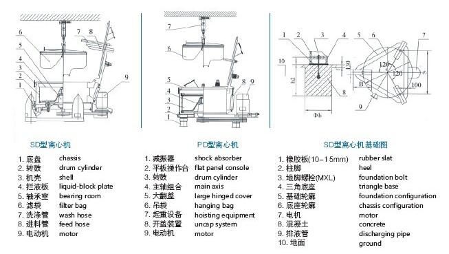 SD、PD型離心機均為開大翻蓋,快開式吊袋卸料,具有電機過熱過載過流保護及其他連鎖保護。